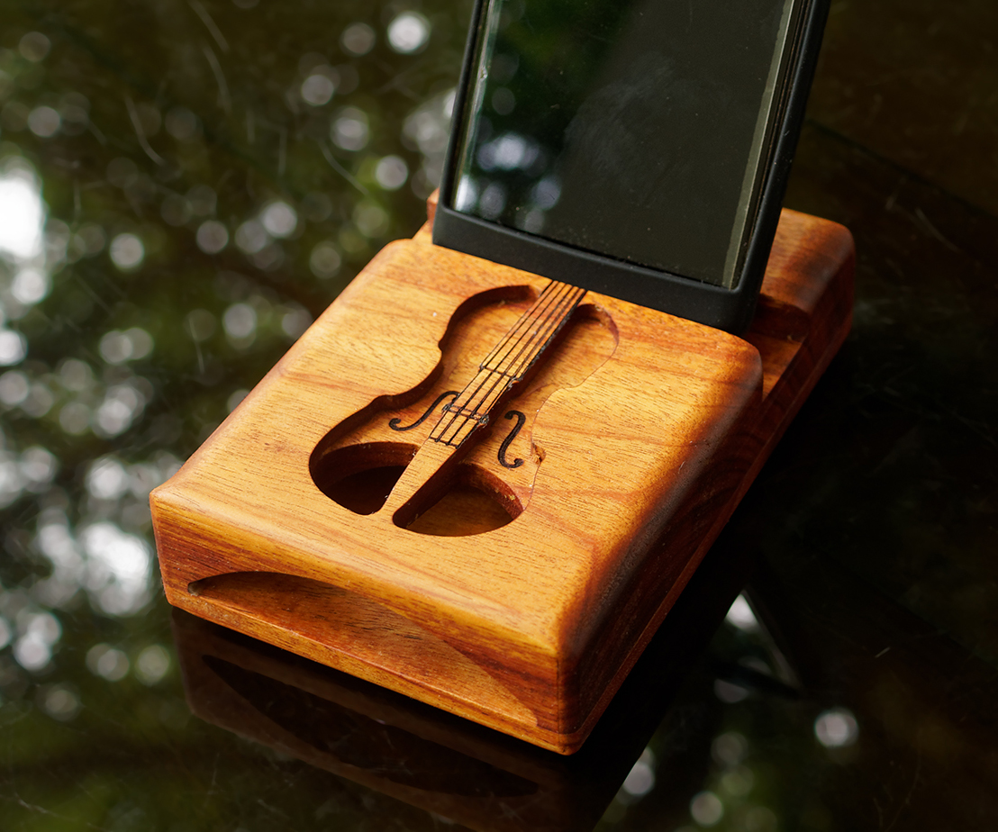 Acoustic phone speaker carved in Macacauba wood in the shape of a violin, then laser engraved for the details
